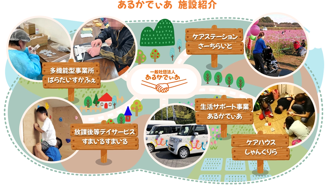 短期入所(ショートステイ)・共同生活援助(グループホーム)を運営しています。夜間、共同生活を営む住居で相談、入浴、排せつまたは食事の介護、その他の日常生活上の援助を行います。